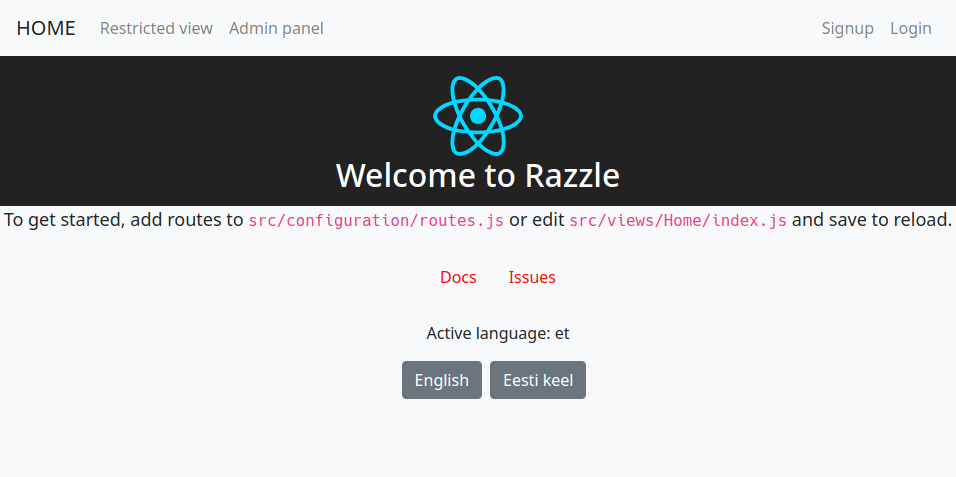 Django, React, Redux, Razzle for server-side rendering, Docker,